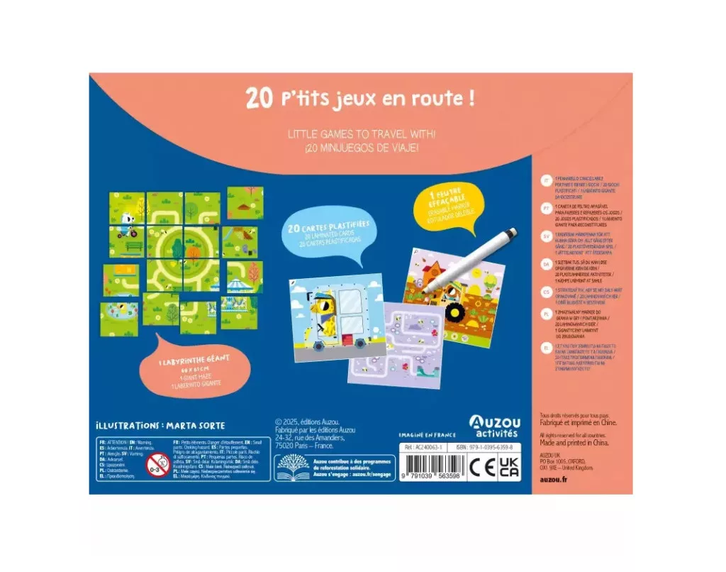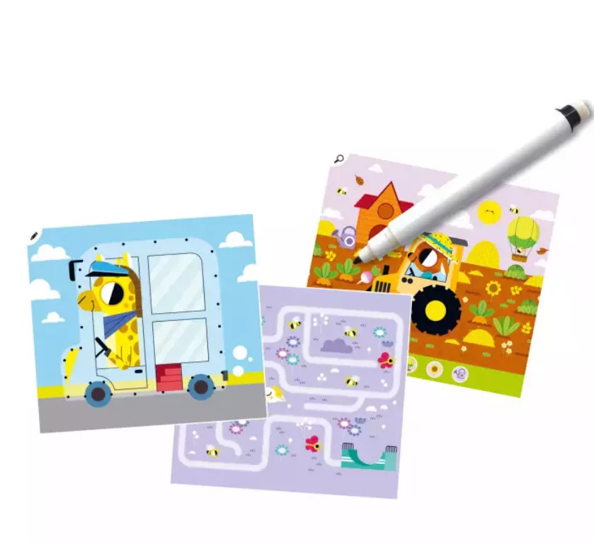 A csomag része egy letörölhető filctoll, amivel a gyerekek a feladatokat könnyedén megoldhatják, majd törölhetik és újból elkezdhetik a játékot.
