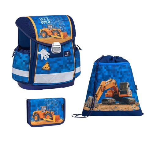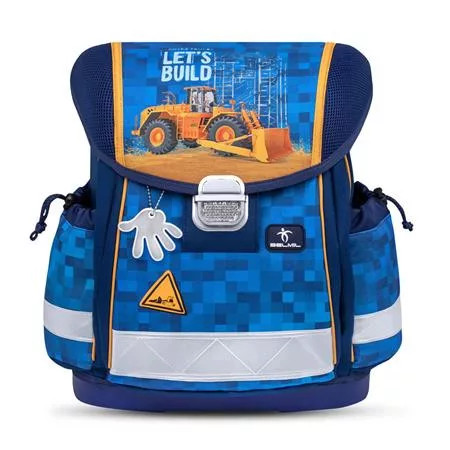 A Belmil "Classy Bulldozer" - iskolakezdési csomag remek színösszeállítással. A Belmil márka termékei direkt a kisiskolásoknak lett tervezve. Az iskolatáska kialakításának köszönhetően gyermekünk kényelmesen tudja viselni erről a párnázott hát és vállpántok gondoskodnak. A mi kedvencünk az iskolatáska kivitelezésében, az az, hogy mindegyik alját körbefutja egy fényvisszaverő csík, mely óvja gyermekünket. A mágneszárnak köszönhetően pedig nem lesz gonja a táska kinyitásával és zárásával.