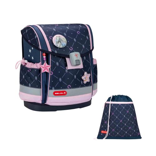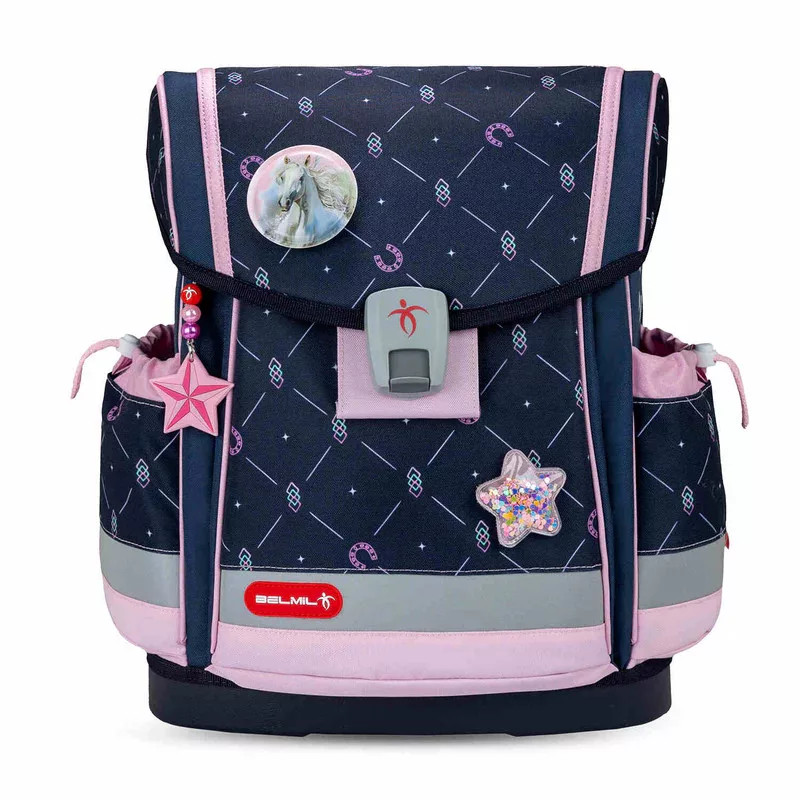 A Belmil "Classy Plus Midnight Galopp" - iskolakezdési csomag egy visszafogott megjelenésű iskolatáska a lovak szerelmeseinek. Visszafogott mintájának köszönhetően, nem válik hamar kislányossá a táska így tovább is használhatja gyermekünk. A Belmil márka termékei direkt a kisiskolásoknak lett tervezve. Az iskolatáska kialakításának köszönhetően gyermekünk kényelmesen tudja viselni erről a párnázott hát és vállpántok gondoskodnak. A mi kedvencünk az iskolatáska kivitelezésében, az az, hogy mindegyik alját körbefutja egy fényvisszaverő csík, mely óvja gyermekünket.