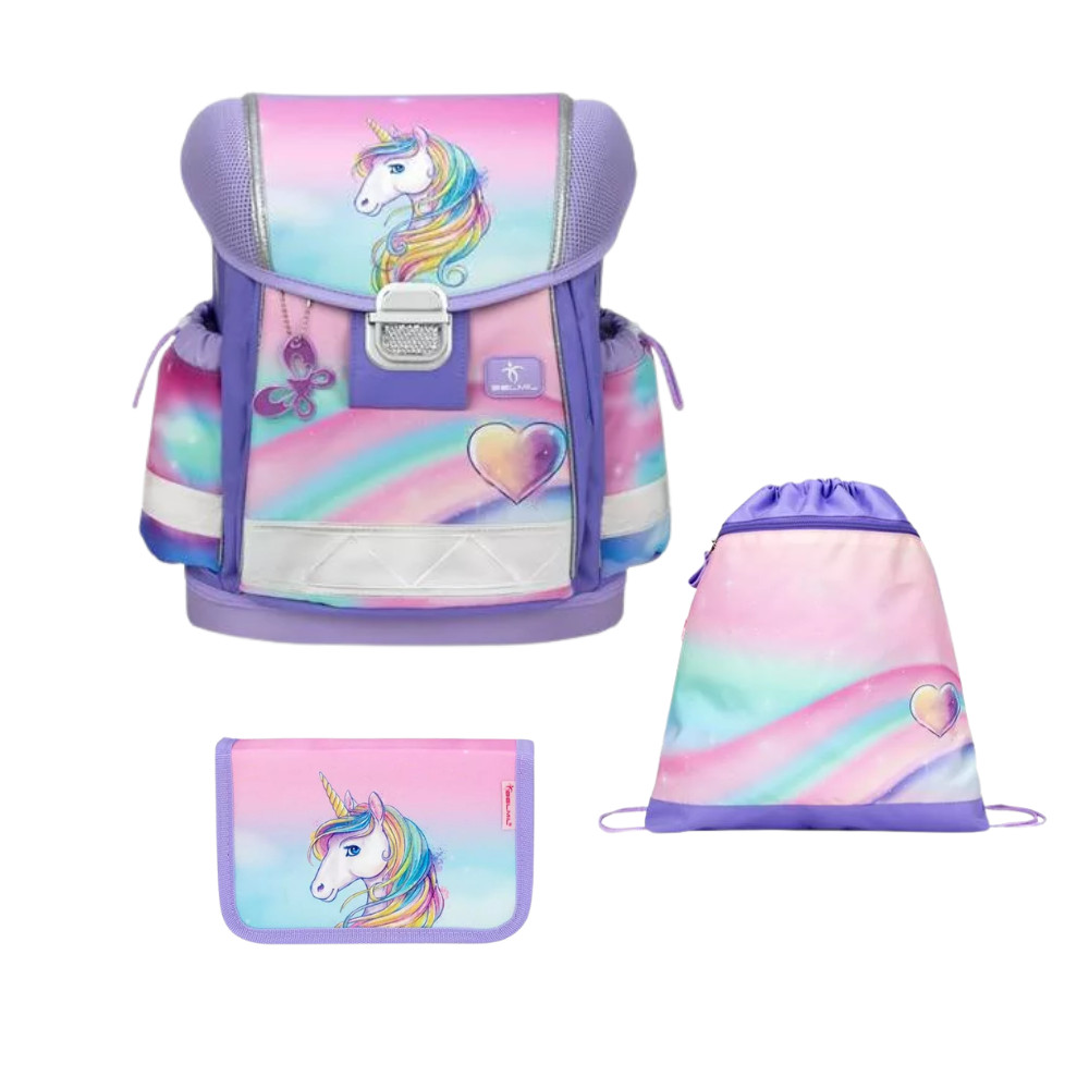 A Belmil "Classy Heart of the Rainbow"" - iskolakezdési csomag egy igazán mesebeli kivitelezésű szett, mely az unikornisokat kedvelő kislányok abszolút kedvence lesz. A Belmil márka termékei direkt a kisiskolásoknak lett tervezve. Az iskolatáska kialakításának köszönhetően gyermekünk kényelmesen tudja viselni erről a párnázott hát és vállpántok gondoskodnak. A mi kedvencünk az iskolatáska kivitelezésében, az az, hogy mindegyik alját körbefutja egy fényvisszaverő csík, mely óvja gyermekünket.