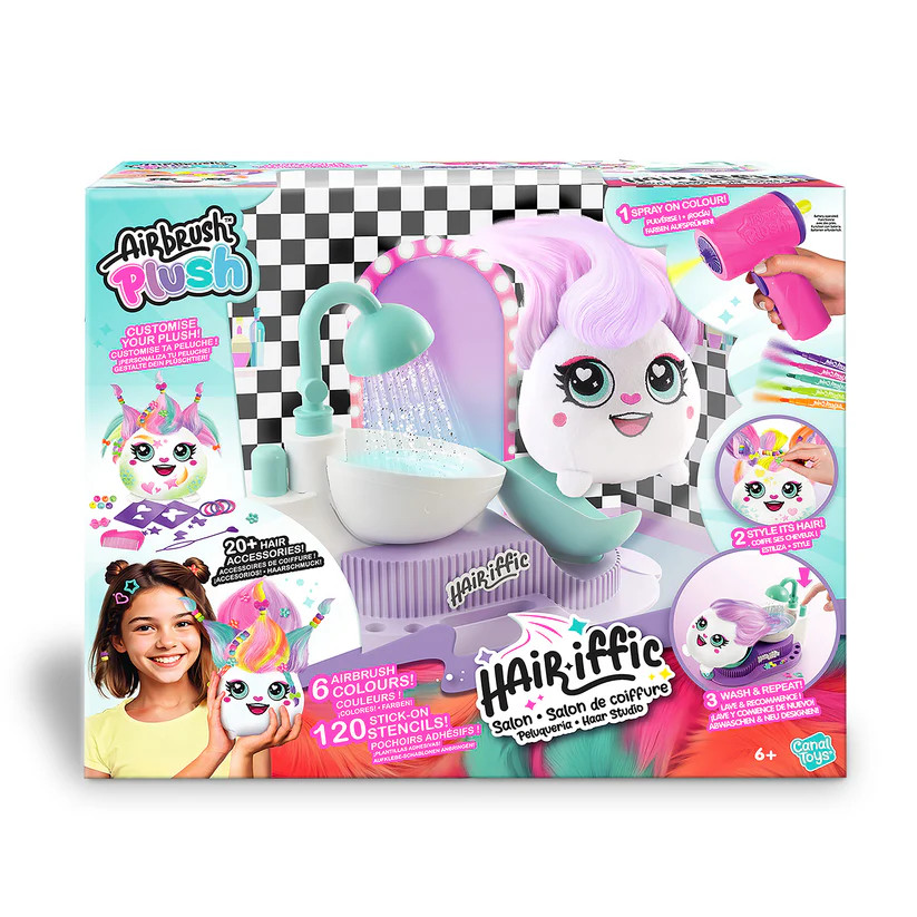 Az Airbrush Plush Hair-iffic szalon egy kreatív fodrász- és szépségszalon játék, amivel a gyerekek kipróbálhatják a hajszínezés és hajformázás varázsát! A legjobb választás minden kis fodrász és divatrajongó számára. Kreatív, újra és újra használható, amellyel a gyerekek mindig új frizurákat és stílusokat alkothatnak.