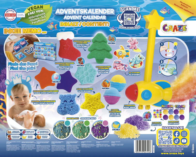 Készülj fel egy felejthetetlen, habos-buborékos adventi utazásra, ahol minden nap egy apró csoda! A Craze Inkee Adventi Naptár - Találd meg a párját nem csupán 24 ablak, hanem 24 izgalmas meglepetés a fürdőszobába és azon kívülre, ami garantáltan csillogást varázsol a gyermeked szemébe!
