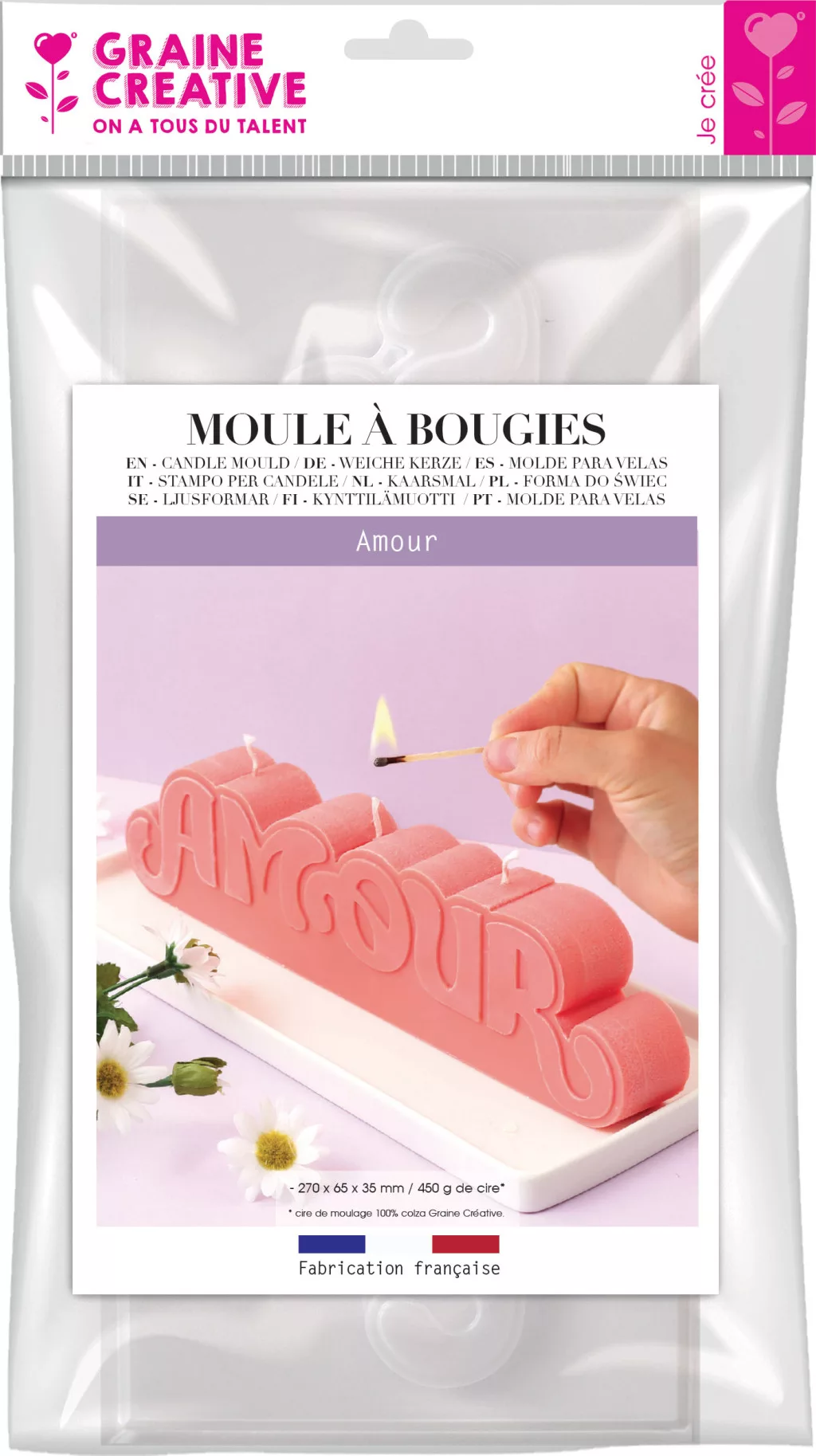 Ezzel a formával különleges „Amour” feliratú gyertyák készíthetők. A látványos felirat romantikus hangulatot ad az elkészült dekorációnak. Ideális választás ajándékhoz vagy különleges alkalmakhoz. A forma többször felhasználható gyertyakészítéshez.