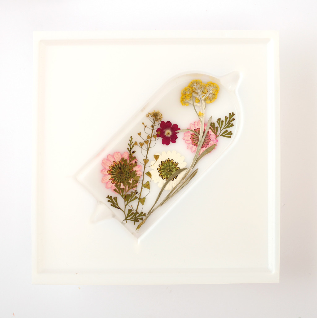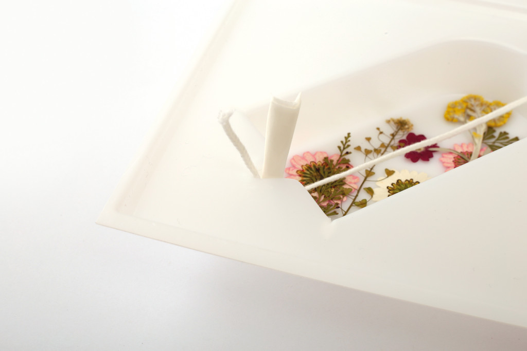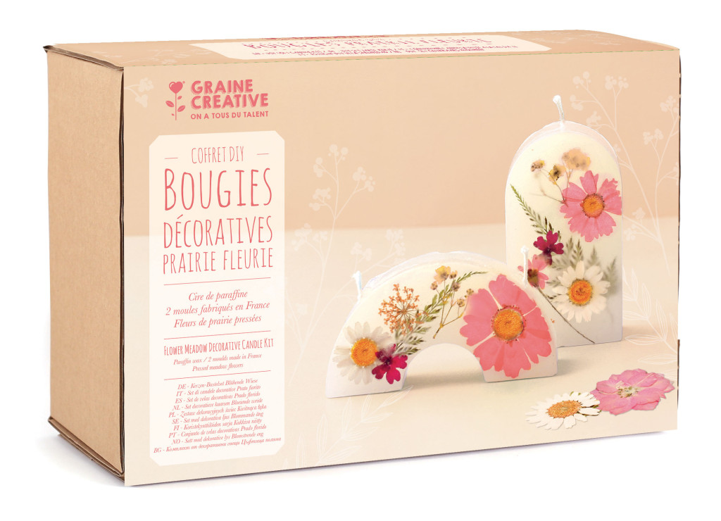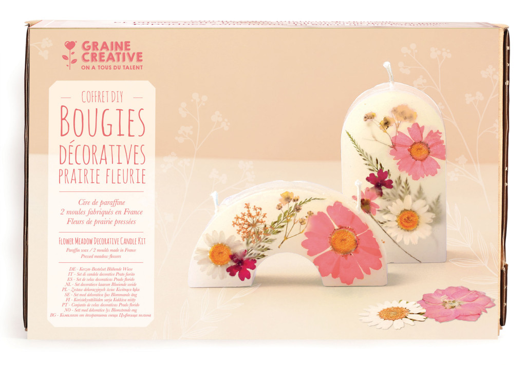 Ezzel a készlettel két dekoratív, geometrikus formájú gyertya készíthető. Az áttetsző paraffin viaszban szárított mezei virágok jelennek meg, ami természetes hangulatot ad az alkotásnak. A gyertyák különösen szépek, ha fény felé tartjuk őket. Az elkészült darabok elegáns lakásdekorációk lehetnek.