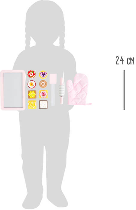 • Valódi kis cukrászoknak: A készlet mindent tartalmaz, ami egy igazi délutáni teadélutánhoz szükséges! A kicsik örömmel gyúrhatják a képzeletbeli tésztát a fa sodrófával, forgathatják a kekszeket a fa spatulával, és persze – a biztonság kedvéért – felhúzhatják a menő sütőkesztyűt is!