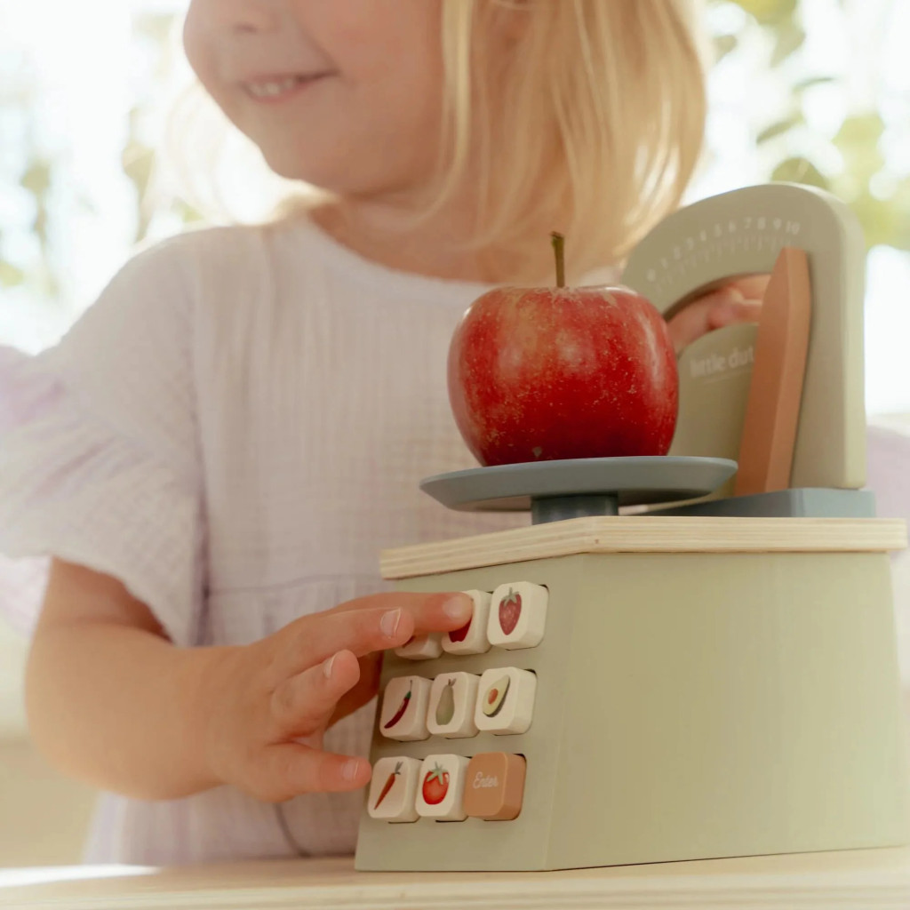 A Little Dutch mérleg tökéletes kiegészítő minden játékkonyhába! Ezzel a fából készült játékmérleggel a kis pékek és szakácsok pontosan kimérhetik az alapanyagokat. Helyezd a termékeket a mérlegre, és figyeld, ahogy a mutató jelzi a súlyt. A mérlegen valódi tekerőgombok és vidám illusztrációk találhatók, amelyek még élethűbbé teszik a konyhai játékot. Tökéletesen kombinálható a játékkonyhával és a sütőszettel a végtelen szórakozásért!