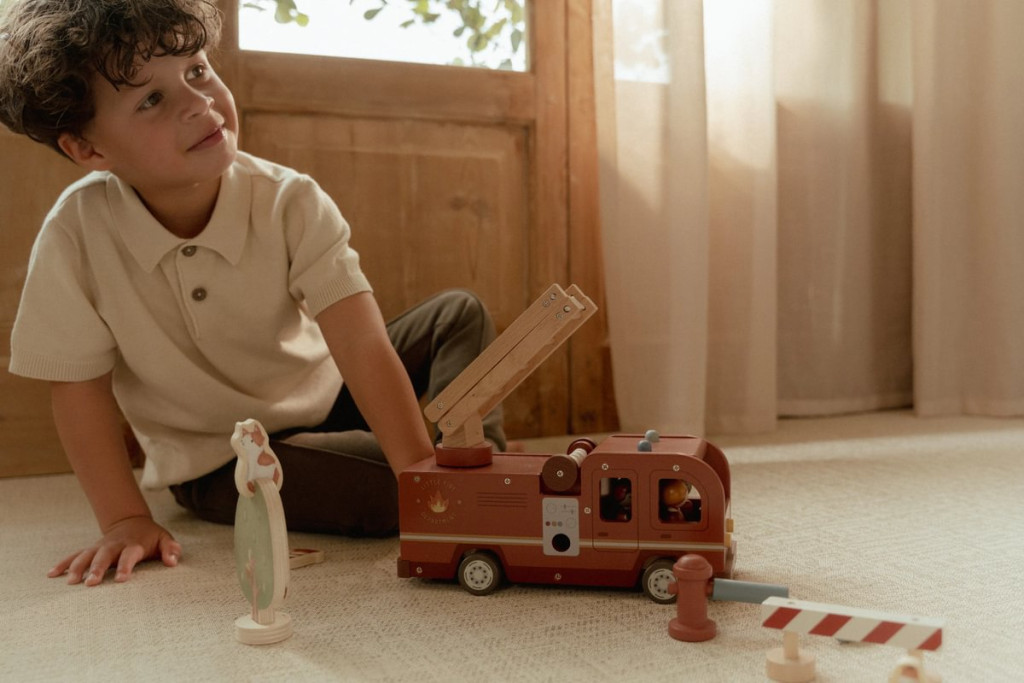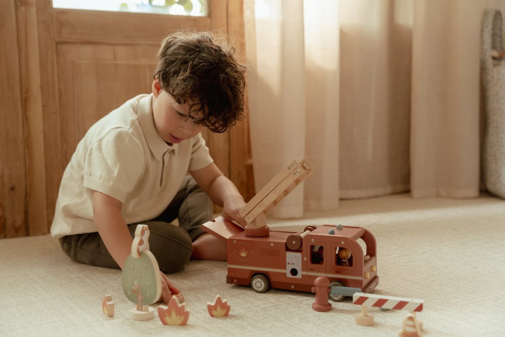 Készülj fel a mentésre! Ez a fa tűzoltóautó készlet teljes felszereléssel érkezik, hogy izgalmas történeteket játszhass el – indulhatnak a küldetések otthon vagy az udvaron.