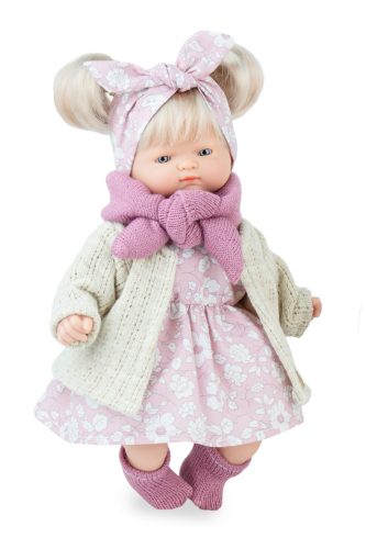 Marina&Pau Díszdobozos Kislány rózsaszín, fehér virágos ruhában és kardigánban, sállal - 26cm