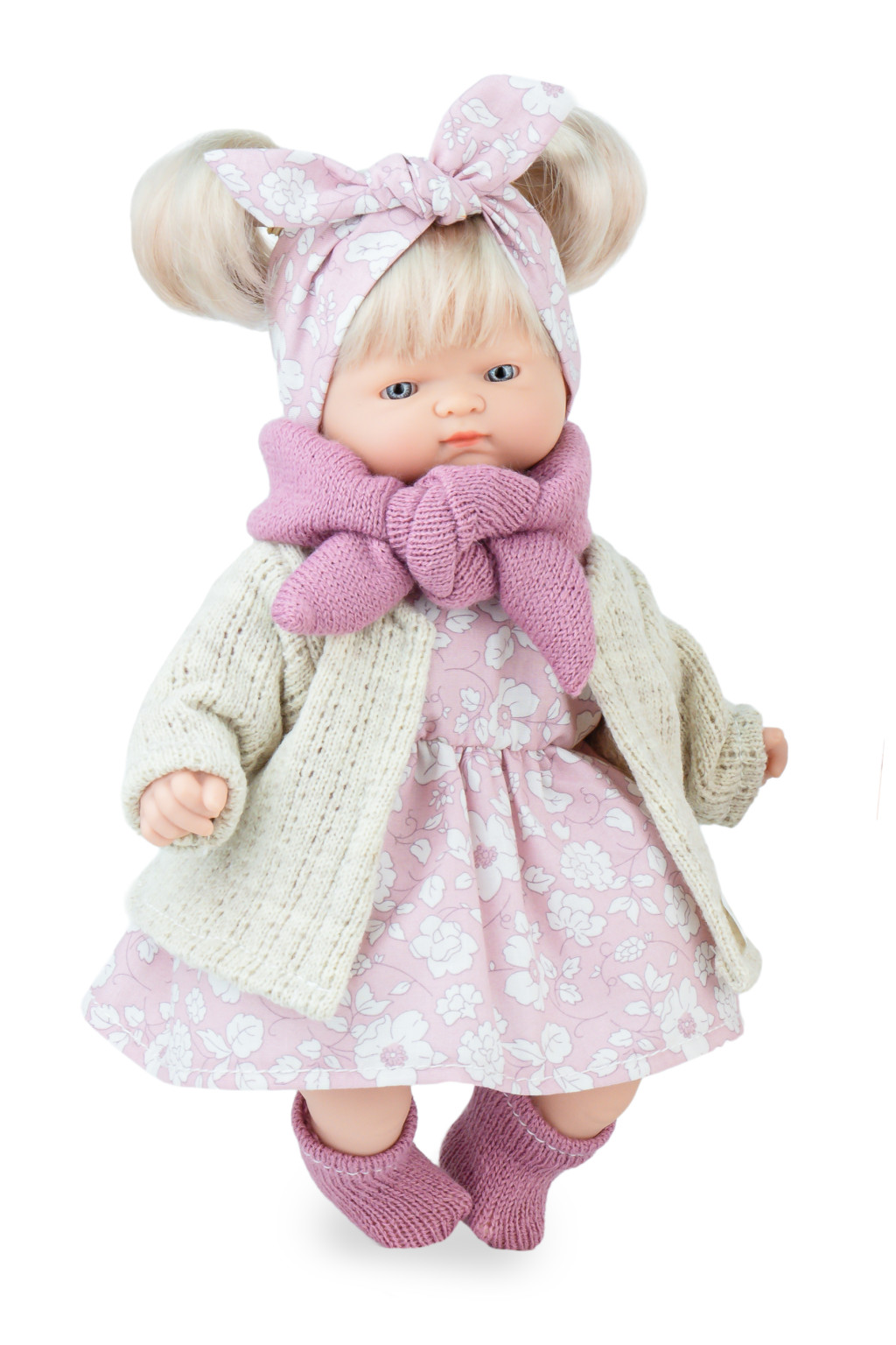 Marina&Pau Kislány rózsaszín, fehér virágos ruhában és kardigánban, sállal - 26cm