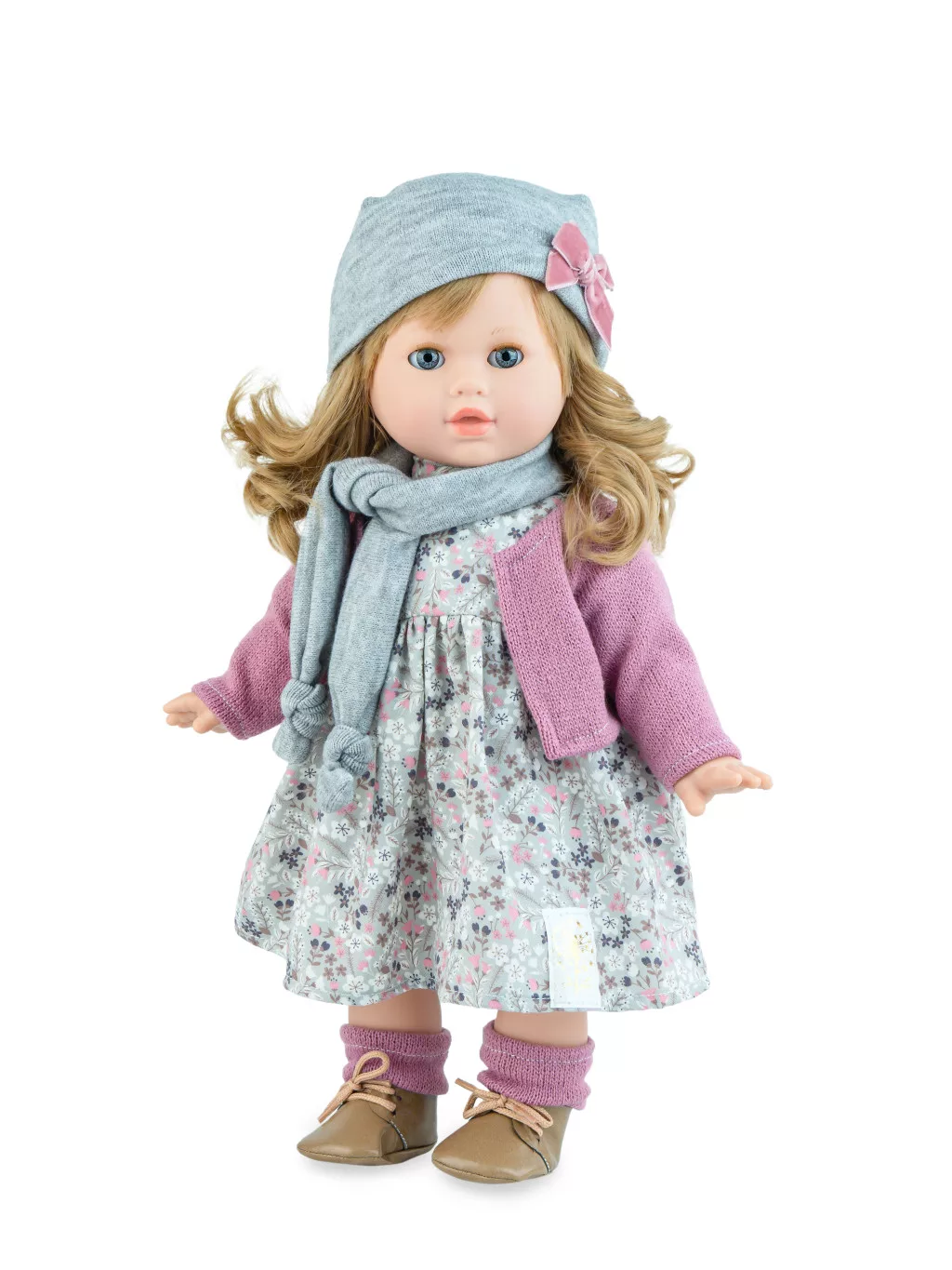 Marina&Pau Tina virágos szoknyában, lila kardigánban, masnis sapkával
