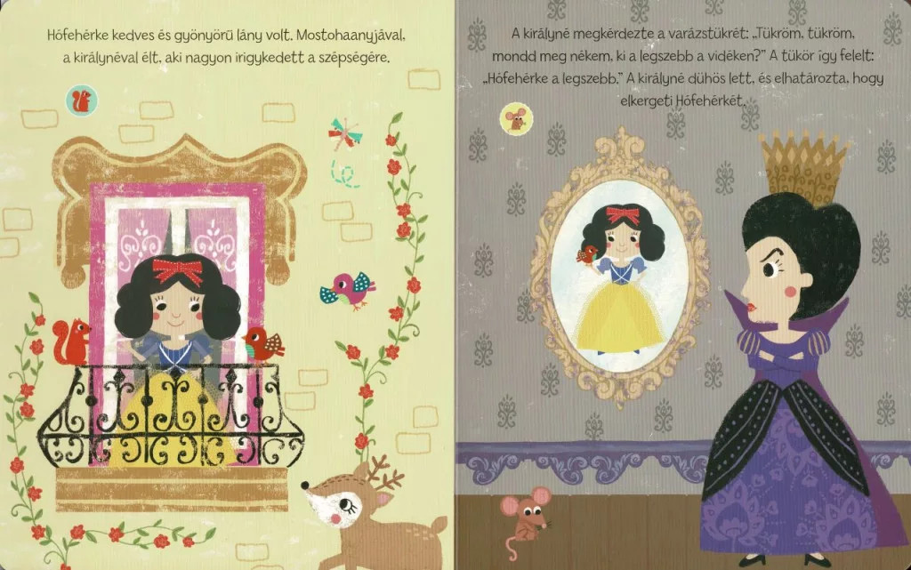 A Mesés hangoskönyvek – Hófehérke és a hét törpe egy varázslatos, interaktív hangoskönyv, amely a klasszikus mese világába vezeti be a legkisebbeket. A jól ismert történet – Hófehérke menekülése a gonosz mostoha elől, az erdei bolyongás, a hét törpe kedves otthona és a bűvös alma cselszövése – ebben a könyvben különleges formában kel életre: a gyerekek nemcsak nézhetik a színes, kedves illusztrációkat, hanem meg is hallgathatják a mese egyes részleteit, így a történet igazán élményszerűvé válik.