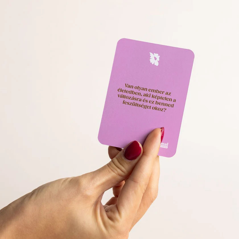 Ez a kártyajáték 90 pszichológiai gondolatot és 90 db - ezekhez a gondolatokhoz - kapcsolódó kérdést tartalmaz, amelyek segítenek elmélyülni fontos élethelyzetekben, kapcsolataink működésében és saját belső folyamatainkban.