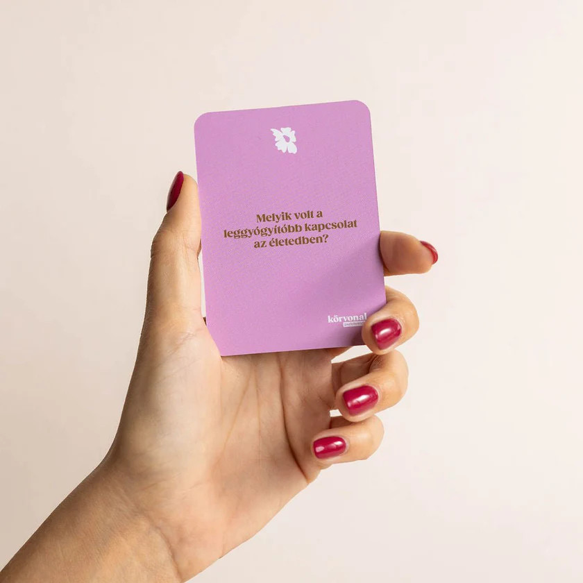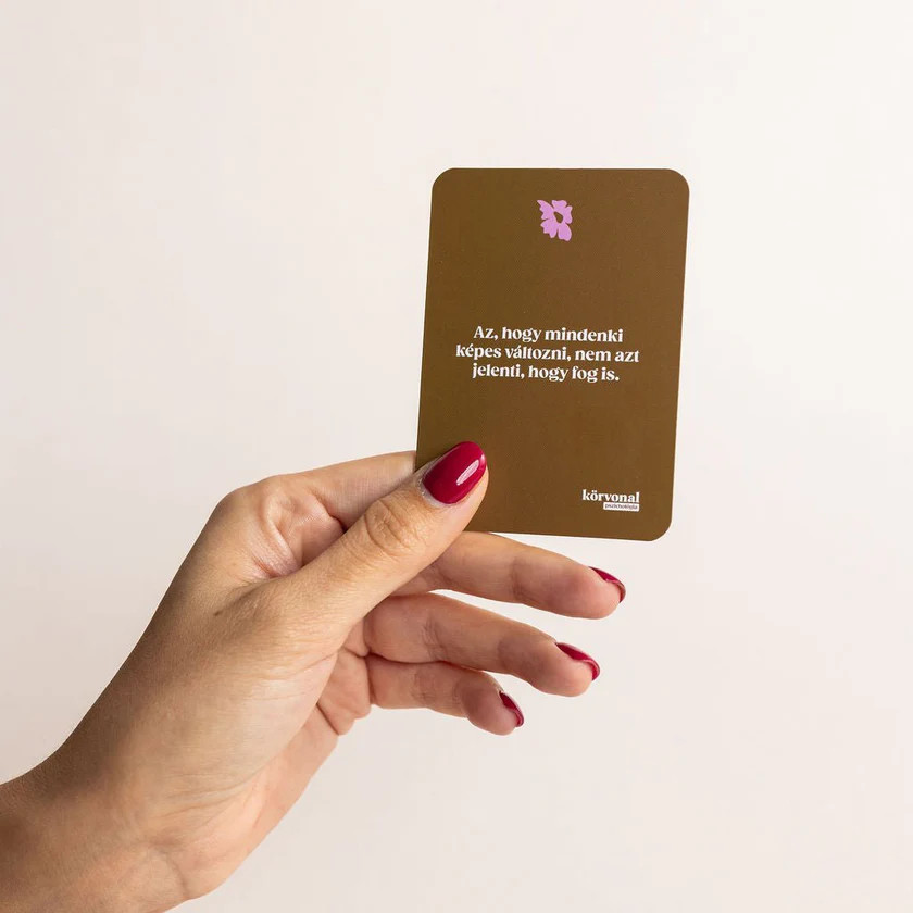 A kártyák olyan témákat érintenek, mint a családi minták, a felelősség, a szabadság vagy a szülői szerep – mindennapi, mégis mély tartalmú állításokkal és hozzájuk kapcsolódó kérdésekkel, amelyek gondolkodásra, beszélgetésre és önreflexióra hívnak.