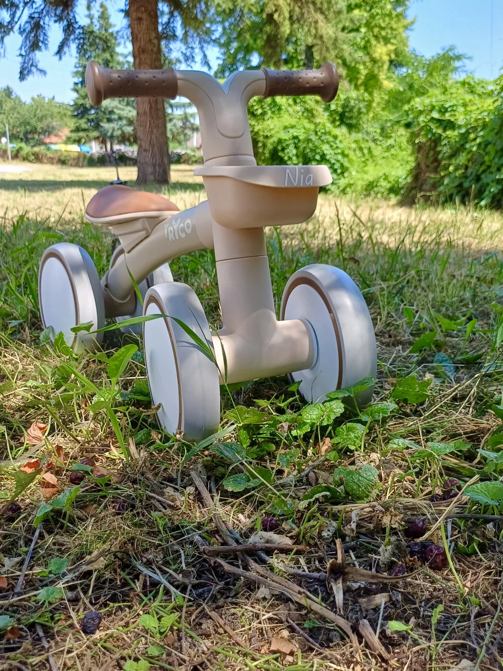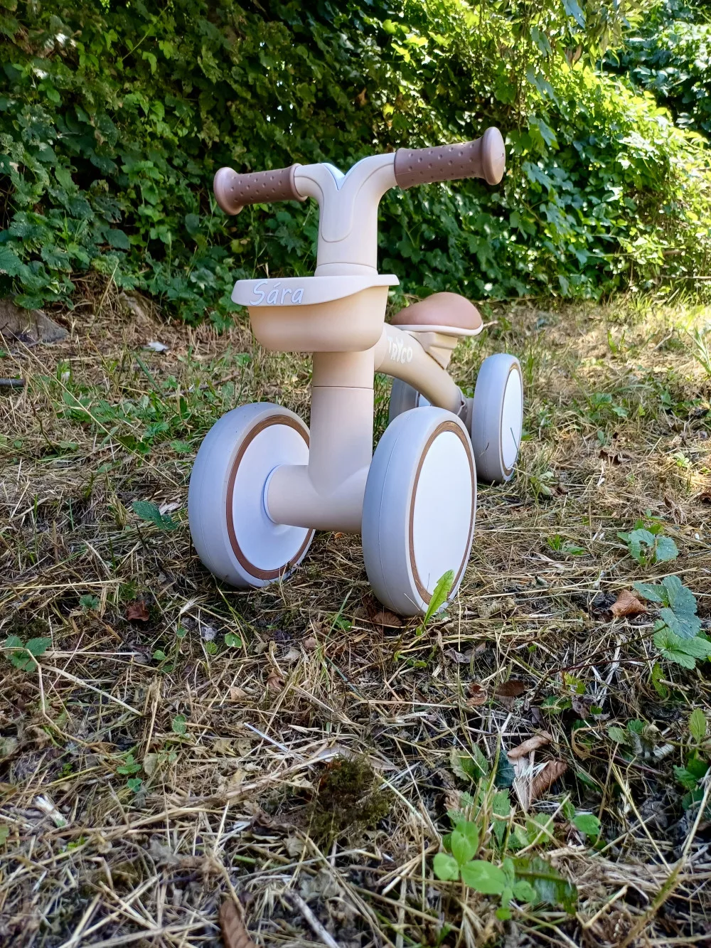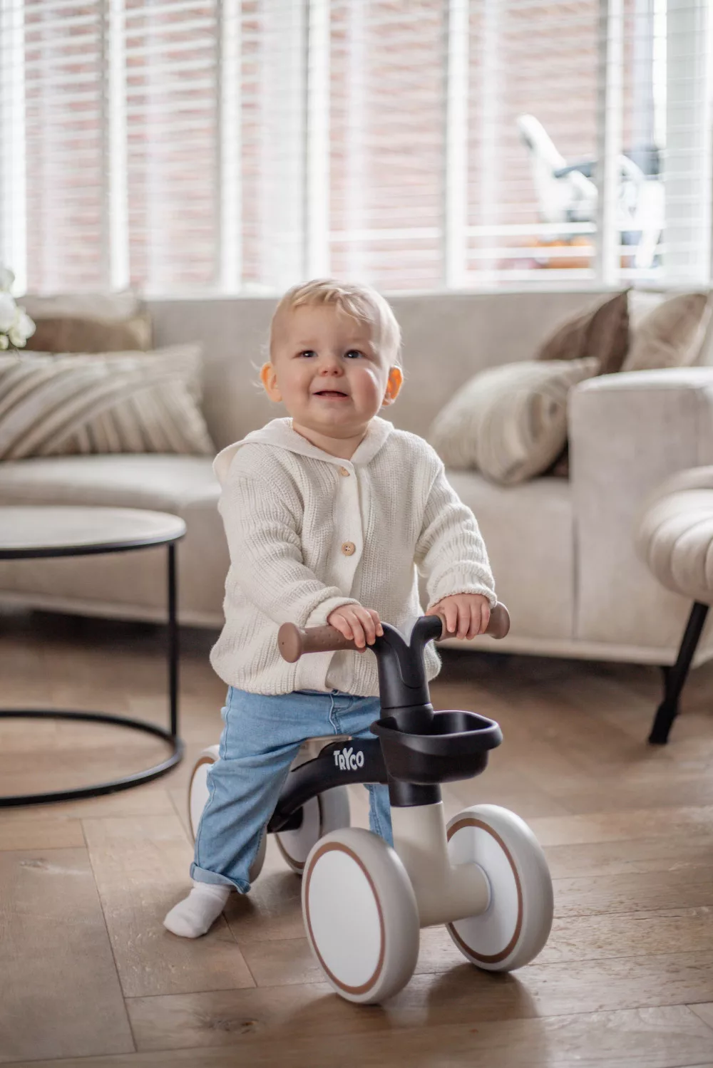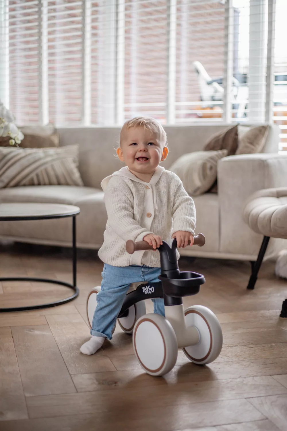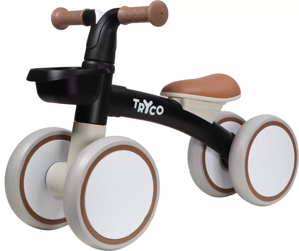 A Tryco első biciklijét a legkisebbeknek ajánljuk. 4 kerekének köszönhetően megfelelő stabilitást biztosít. Alumínium vázának köszönhetően a bicikli súlya 2,1 kg. A kormány markolata csúszásgátló felülettel van ellátva így biztosan markolhatja gyermekünk. És amivel biztosan belopja magát a kicsik szívébe az a kis tároló a bringa elején, így könnyen vihetik magukkal kedvenc játékukat is az útra, de akár egy kis kulacs vagy egy kis harapnivalót is tehetünk bele. Ez a fekete a natúr színekkel kiegészítve, igazán modern és divatos megjelenést kölcsönöz a biciklinek, így nem csak remek szórakozást nyújt, de még szép is.