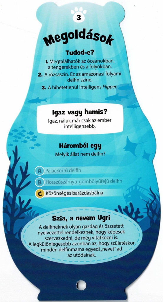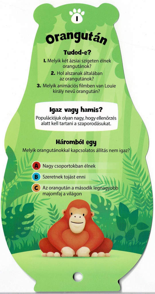 A dobozban 46 kártya található, mindegyik egy-egy izgalmas állatot mutat be, a jól ismert oroszlántól és delfintől kezdve egészen olyan különlegességekig, mint a narvál, a sarki nyúl vagy épp a kacsacsőrű emlős. Minden kártya három játékos kérdésből és egy „Igaz vagy hamis?” feladványból áll, kiegészítve egy tréfás vagy meglepő információval, amely biztosan mosolyt csal a gyerekek arcára.