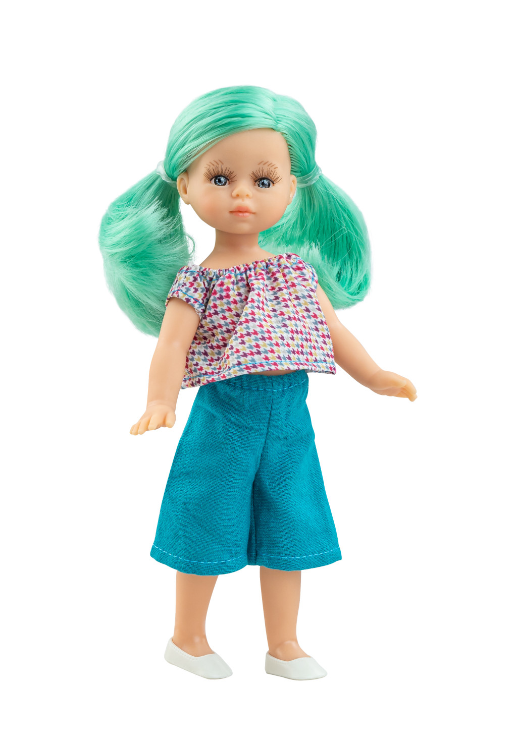 A Paola Reina Sandra ruhaszett egy színes, vidám összeállítás, amely a 21 cm-es Mini Amiga babákhoz készült. A mintás felső és a hozzá illő nadrág friss, modern stílust ad a babának.